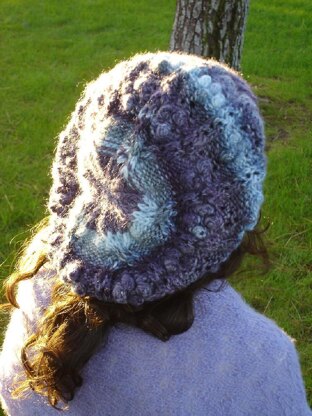 Mayla is a feminine slouchy beret knitted in the round, bottom up, with little bobbles and lacy cables that twists at the crown creating a beautiful floral form resembling the variety of water lily known as “Mayla”.