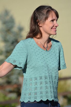 McKenna features a lower body knit in a deep lace pattern, with a simple texture pattern for the bodice. A flattering sweetheart neckline finishes the bodice. The look is completed with short sleeves featuring the same stitch patterns as the body.