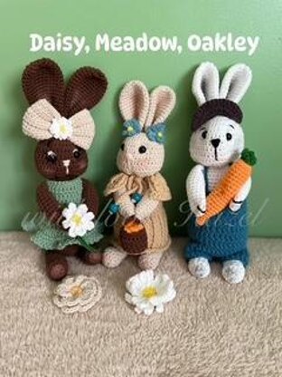 Meet Meadow, Oakley, and Daisy! The adorable trio from my Meadow & Friends crochet series, now available together in one convenient download! Each handcrafted bunny stands around 25–27cm tall and comes with charming outfits and accessories that make them truly special: