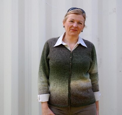 This design features an innovative way to use long-repeat or ombre yarns that makes a feature of the way the garment pieces fit together because there are no side seams in this design. Instead, the slow-changing colors of the yarn are shown off to great advantage where the two pieces of the body meet in the center-back seam. The classic V-neck styling, narrow borders and three-quarter sleeves make this a very easy style to make and to wear. As an added bonus, the pattern also includes instructions for making the companion 'Sunset' cardigan; an off-set striped version of this design.