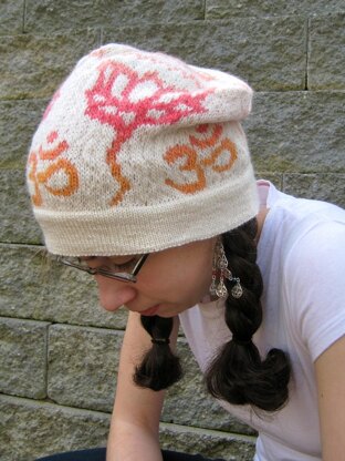 This hat is here to remind you to take a deep breath and relax. Om symbols and lotus flowers circle the hat.