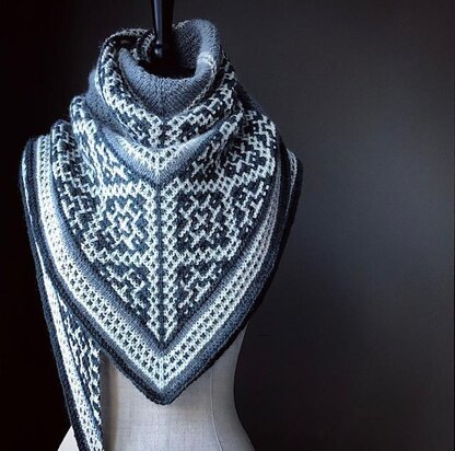 Meet Me at Midnight is an elongated triangular shawl, knit flat, from the top down. Its gorgeous mosaic pattern is surprisingly simple to knit, using just one color per row to create stunning results. Choose 3 shades of The Fibre Co's LORE to create this beautiful shawl for yourself! (Sample is knit with one skein each of Mystery, Logical and Truth).