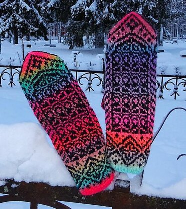 Meet Me at the Gate is a stranded colorwork mitten pattern featuring geometric design reminiscent of intricate iron-wrought gates. The mittens have an afterthought thumb construction. The pattern is charted for the use of two contrasting colors but will also work well for show-casing self-striping or gradient yarns used as contrast color.
