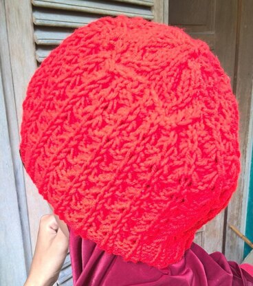 I am using drop stitch which I interpret as Jasmine flower motif for body. Jasmine flower motif in this hat reminds me of “Roncean Melati”, traditional head piece accessories used by brides in traditional Javanese wedding. The flower crown on top is my version of Rose, the symbol of women’s beauty.