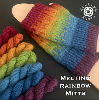 The Melting Rainbow Mitts were inspired to accompany the Melting Rainbow Cowl. They take the colourwork pattern used in both the cowl and the socks design to create a cute pair of handwarmers.
