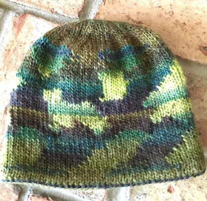 This hat was worked in double knit stitch with 2 separate yarn strands. Colors were coordinated by separating the light an dark parts of each skein to achieve a camouflage look. It was knit from the bottom up.