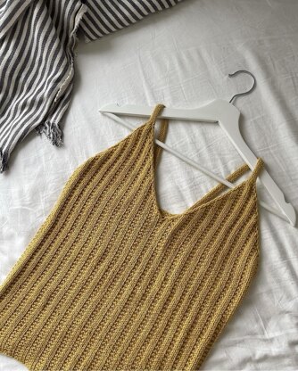 The Merle top is worked from the top down in a double broken rib stitch using one strand of Drops Cotton Merino on 4 mm needles. The top consists of two triangular front pieces, each with a strap at the top, which are attached to the straight back. The top is form-fitting and beautifully highlights your figure.