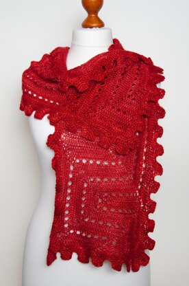 The stripes in this shawl twist and turn to form a merlon pattern. It is crocheted in slip stitches. The shawl is based on my technique of long rows: Once the setup row is done, the rest of the shawl is relatively mindless. Lace rows set off the patterning.