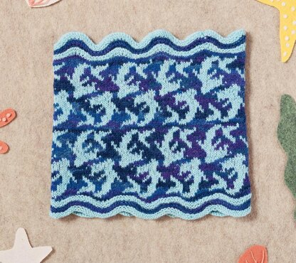 The Mermaid Cowl is an easy colorwork accessory combing both Stroll and Stroll Tonal. At a distance the image, like the mystical Mermaid, is hard to spot at first. Upon closer inspection, you can see the tiled mermaid silhouettes. The simple feather and fan edge finishes it off, giving the feel of waves.