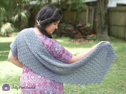 The design is pictured in a crescent/trapezoid shape, but could be easily made into a deep full triangle shawl by simply continuing the pattern repeats until you reach a point.