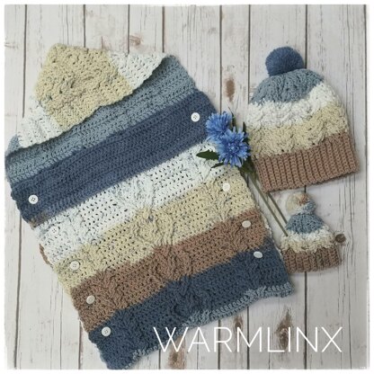7 pages PDF included Sleepsack: Length to hood top when fold: 25 in Width: 16 in Baby beanie: fits most newborn baby with head circumference approx. 10-11 inches. Mom beanie: fits most adult with head circumference approx. 21-22 inches.
