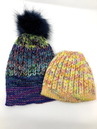 This hat can make a great stash buster project! My long brim version used 9 different yarns with total weights ranging from 37g to less than 5g (total weight 145g). Other versions used two 50g skeins or a single 100g skein.