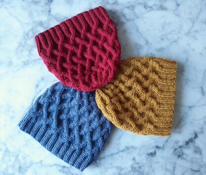 The Mervue Beanie (named after a Galway neighbourhood) takes a classic Aran style lattice pattern and adapts the motif to work it in the round, on two sizes of circular needle. The finished hat is seamless, with the cables flowing from brim to crown without interruption.