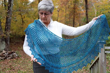 The Meshing Around Shawl has a crescent shape that is worked from the top down beginning with a long garter tab cast-on. The instructions for this cast-on result in a nice curved edge that’s a breeze to block without the dreaded garter hump! The shawl body alternates between a mesh pattern and a garter stitch stripe containing a single row of eyelets. Once the wingspan has been reached, you’ll work on the elegant sawtooth lace edging. Change yarn colors or continue working it with the same color, it’s your choice. As you work the edging you’ll also be binding off all the shawl stitches at the same time. Only a 16 stitch bind off is needed once the edging is done.SKILLS NEEDED: K2tog, p2tog, yo, kfb, m1, backwards loop cast-on;