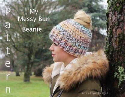 My Messy Bun Beanie Crochet Pattern By Kerry Jayne Designs PATTERN INSTRUCTIONS AND TUTORIAL Includes beautiful close up photo tutorial with easy to follow instructions. My Messy bun beanie crochet pattern is quick to make and fun and practical to wear! It is crocheted with an easy stitch pattern using super bulky yarn. Designed to be worn so that your hair can be pulled through the hole, great if you have long hair, a pony tail, or you just want your hat to fit over your bun :-) Most super chunky yarns may be used for this pattern.