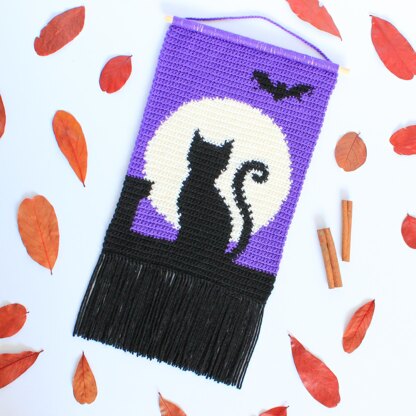 Midnight Cat Wall Hanging Digital Pattern This crochet pattern gives you instructions on how to make your own Midnight Cat Wall Hanging, perfect to add to your Halloween home decor. The colours can easily be changed to match your theme! Add a bit of spookiness to you home. 📋Pattern Details - Written in US crochet terms - Written Instructions and Pattern Graph available - Suitable for beginners, but it does require you to have some knowledge of crochet terms. - Intarsia Crochet technique used - Pattern is available for instant download once you have purchased. - This pattern will create a wall hanging that is 22.7cm wide and 31.6cm tall (without the tassels), when the suggested yarns are used. - Pattern has been tested by pattern testers 📏Materials Required • 4.00mm Crochet Hook • Acrylic DK in 3 colours • Scissors • Tapestry Needle • 25cm of Dowel