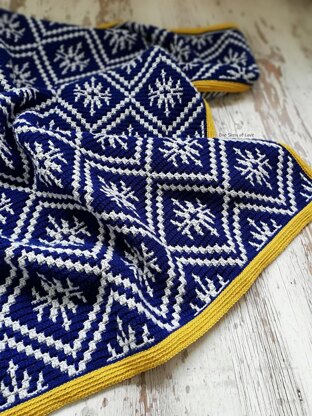 “Midnight Snowflakes” blanket uses the mosaic overlay technique and is written in english (US terms). It has more than 100 pictures, to help you through all rows and rounds, and explanations for all crochet small techniques used. Also, it has a stitch guide and charts with body and border patterns.