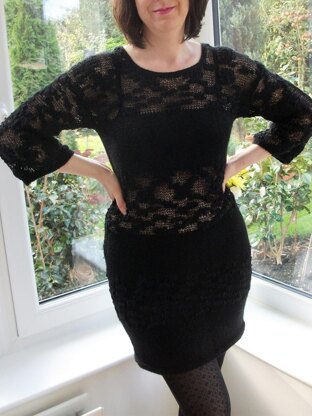 An easy knit in stocking stitch with garter stitch edges, using Glitz, a solid double knitting yarn with a very subtle shimmer, together with Opium which is a gorgeous thick 'n' thin yarn producing an almost abstract lace effect. This fancy yarn does all the work for you! This tunic dress is super flexible for dressing up or down and makes an interesting knit.
