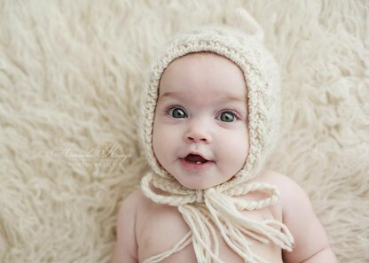 The Midwinter hood is the sweetest way to keep little heads warm during winter. With a chunky cabled edge to frame those sweet baby faces, and a whimsical pixie pointed hood shape complete with braided ties.