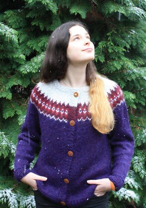Miekki is a seamless top-down yoke cardigan which is knit flat. It features stranded colorwork around the yoke, which starts with a pale, neutral contrast color, features two other striking hues, and inverts into a vivid main color. Once the colourwork is complete, the remaining yoke is shaped further with raglan increases. There are short rows at the neckline for a comfortable fit, and optional waist shaping to add feminine shape. The hem and cuffs are finished off with ribbing. The front of the cardigan has buttonbands that are worked in ribbing and use 5 buttons.