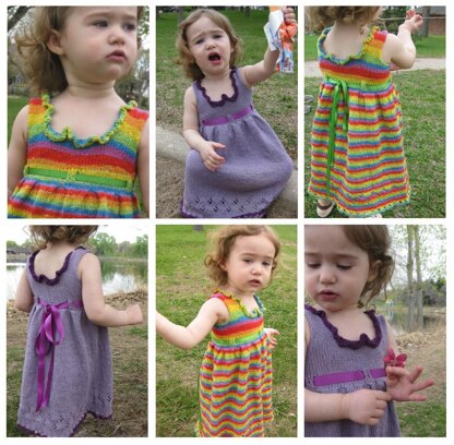 The Mila Sweetpea Dress was inspired by my little one, Mila, whom I call “Sweetpea.” It is a great dress for the spring or summer and is adorable in almost any variation of yarn. The dress is worked from the bottom up and includes scalloped edging, eyelet diamonds, a flouncy full skirt, empire waist, belt loops, and a ruffled neckline.