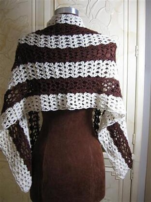This shawl uses simple openwork lace patterns in stripes of cream and rich brown.