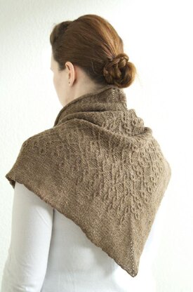 The shawl is knit from the top down with a tab cast on. The body of the shawl is knit in reverse stockinette with a raised cable pattern. The edges of the shawl are also knit in reverse stockinette creating a rolled edge.