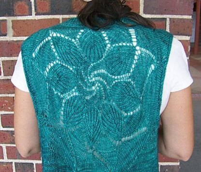 This vest is worked seamlessly. The vest starts by working the Leaf motif in the round. After that you work back and forward shaping the back of neck and the left shoulder and then finishing with the left front until the underarm. Then you work the right shoulder and the right front . After finishing shaping of the armholes all pieces need to be connected and knitted top down. Short rows shape the curved lower edge.The I-cord around the back of the neck and both fronts are worked at the same time as the body. The designer gives you ideas about how you can modify the pattern,if the size of your Leaf motif does not match with the pattern or you'd like to make the vest shorter.