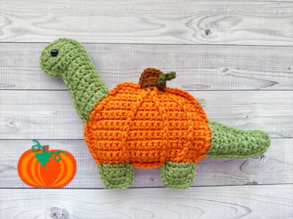 Our finished Mini Dino Pumpkin is 7" x 11" tall. Hook size, yarn choice, and crochet tension will affect each individual result.