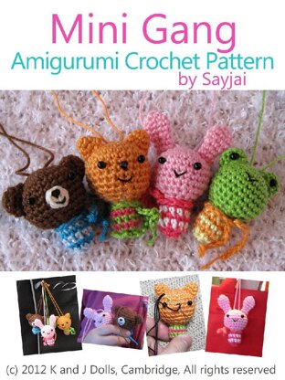 A crochet pattern for a tiny cat, bunny, frog and bear. They are only 2 inches or 5 cm high (excluding ears). You can hang them on a keychain, a bag or give them away in a party gift bag. They are very easy to make. This is an ideal pattern for beginners.