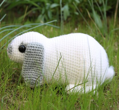 yarn in white and a bunny-appropriate patch color ~ crochet hook: 3mm or size that gives you a tight, no-gaps fabric ~ black plastic eyes: 12mm for DK yarn ~ if using sew-on eyes, dental floss or strong thread to attach them ~ pink embroidery floss, and a large, sharp point embroidery needle ~ fiberfill stuffing ~ stitch marker, pair of scissors, yarn needle, pins ~ optionally, small piece of Velcro to fluff up the tail