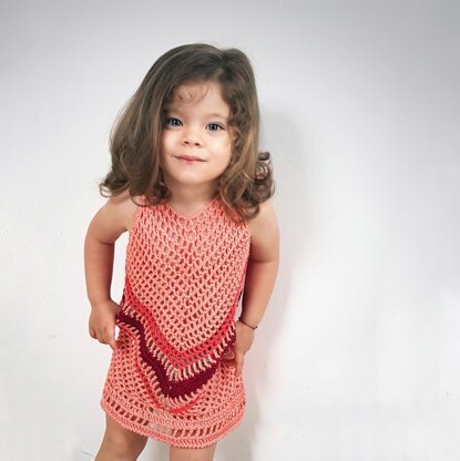 It's worked top down making the first 2 rounds for the shoulder straps and then we will work the front and back side separately for a few rounds to shape the arm holes and to make the top of the dress. After these few rows we will join the back and front and start working in rounds again. To create this V shape in front we will increase in middle of the front and back. After joining the parts we will have to decrease on sides to keep the dress straight.