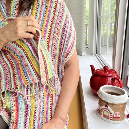 This cozy scrappy wrap has beautiful texture but is made up of simple crochet stitches! It is perfect for mini skein sets and advents, or for stash busting leftovers, and can also be made in a single colour. It would be fun to add a bit of mohair or textured yarn to the occasional stripe too! The length and width are adaptable and the fringe has a fun braided option.