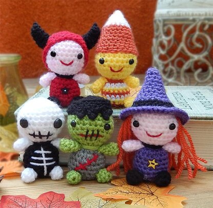 This pattern includes instructions to make a Frankenstein's Monster (or Frank for short), Witch, Candy Corn, Devil, and a Skeleton.