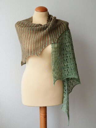 Mint Chocolate is a shallow triangular shawl knit sideways. There is just something about the combination of striped garter stitch and openwork that appeals to me: Lazy mindless knitting, together with patterning that requires a tad more attention. The perfect project for me!