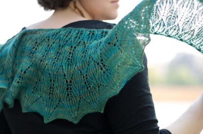 Mirèio is an airy lace scarf featuring a leafy pattern. The pattern features a tubular cast on, wrapped stitches and a twisted ribbing. The scarf is shaped like a C which gives the scarf a slight ruffle when worn.