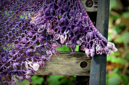 The shawl begins at the back of the neck and is worked top-down in varying sections of Filet or Tufts to the lower edging. Increasing is done at the row ends and at the center spine. The shawl may be varied in several ways: