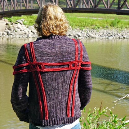 The body of the sweater is knit sideways. A construction schematic is given on page 65 to illustrate construction. Stitches are then picked up to work the yoke from the bottom up, with sleeves joined at the underarm. The vertical shoulder welts are created with applied I-cord. The attached yoke creates a. drop shoulder silhouette