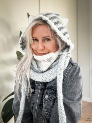 Introducing the Misty Cat Hood and Cowl Set for kids and adults! This charming accessory is perfect for keeping you stylish and cozy during the autumn and winter months. With its playful pointed ears and whimsical paw-tail ribbon, the Misty set will make you the center of attention wherever you go.