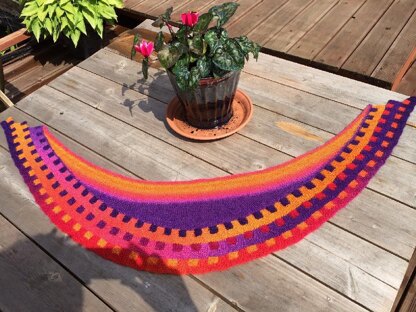 Using two balls of this beautiful variegated yarn at the same time creates endless colour combinations for this crescent shaped shawl (cowl, neckerchief, scarf, wear it as you like !!)