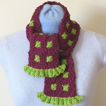 Mitred Squares, also known as Domino Knitting, also known as Modular Knitting - some of the names for this great patchwork technique. Each square is picked up from those around it so there are no seams to sew to make this scarf. It has a frilled edging on each end.