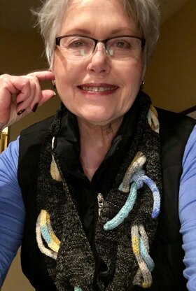 - Add your favorite scarf to run through the holes for a unique look. Another suggestion is to knit up some contrasting colored I-cord and add that.