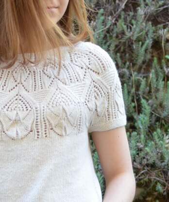 Miya is a light summer tee made in 100% cotton yarn by Katia Yarns. It is a seamless top-down tee with an interesting lace pattern on the round yoke and decent stripes of lace on the sides as mock seams to visually separate the back and the front. The picture shows size 2 with 6 cm/2.5” of positive ease.
