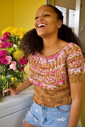 The MJ Crop features Cat Sandwich Fibers and utilizes those stripey sock yarns for a fabulous stranded knitting project---all inspired by the badassery of Cardcaptor Sakura. The design is worked top-down and features a circular yoke with a high/low split hem and subtle ruffled bind off and ribbed sleeves. Wear this top all summer long with your favorite pair of shorts or throw it over your fav frock with a jean jacket for fall!