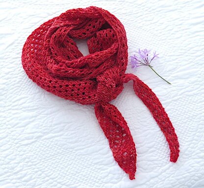 The sample scarf measures 50 cm / 19½ inches by 168 cm / 66 inches by 204 cm / 80 inches after blocking.