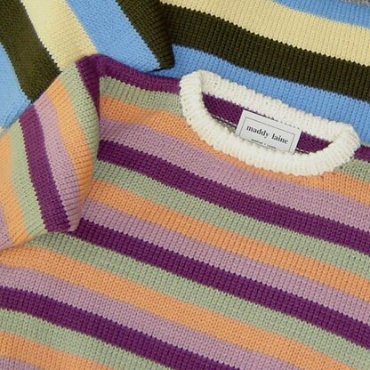 A maddy laine family-sized pattern for a striped, crew-neck pullover with drop sleeves to knit in worsted weight yarn.