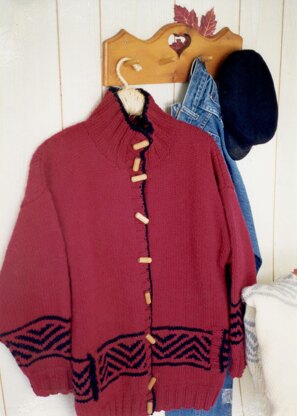 A maddy laine knitting pattern for a unisex outdoor jacket that features a decorative band of contrast color, a stand-up collar, and vertical pockets.