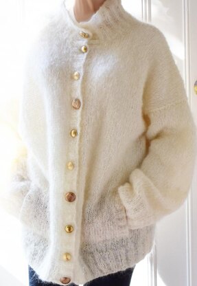 This cardigan pattern calls for chunky weight yarn for quick-knitting coziness. A vertical pocket on each side of the fronts match up with deep ribbing and drop-shoulder sleeves to keep that warmth alive. Five sizes are in this pattern with one sure to keep you buttoned-up this winter. Knit this pattern oversized so that it will afford lots of cozy comfort.