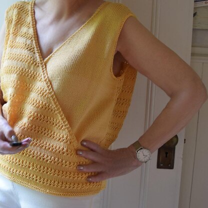 A maddy laine knitting pattern for a women’s topper to knit in a lacey stripe pattern in fingering weight yarn available in FOUR sizes.