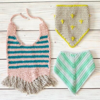 These darling modern crochet baby bibs are perfect for your little drooler or your messy toddler. These bibs are for the modern mama, and will make an "oooh"-worthy baby shower gift. The pattern pack includes a toddler sized boho fringe bib, a baby-sized triangle chevron bib and a baby-sized triangle cactus print bib. Be sure to make your modern crochet bibs out of soft cotton yarn so they are perfect for your baby to drool and chew on!